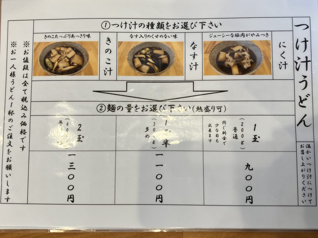 Menu: You have a choice of fungi, eggplant or pork soup. You can chose a serving size of 1, 1.5 or 2 udon.