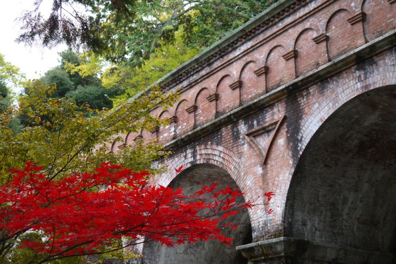 This is the waterway bridge of the Lake Biwa Canal within the Nanzen-ji Temple grounds. It was built in 1888 and designed to complement the landscape of the temple grounds. The bridge features brick and granite arch piers.