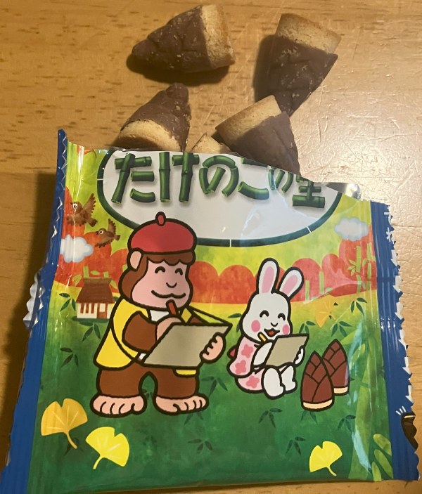 These snacks are small biscuits that are partially covered with chocolate. They are shaped like mushrooms and bamboo shoots. Both are very popular in Japan.
