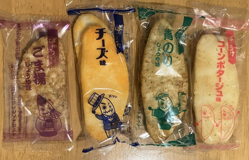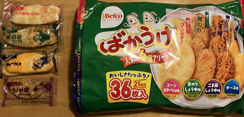 Bakauke is a popular Japanese rice cracker. There are many different flavors of Bakauke. This bag contains green seaweed and soy-source flavor, Fried-sesami and soy-source flavor, Cheese flavor and corn potage flavor.