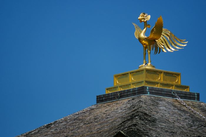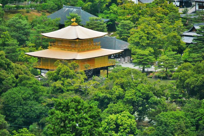 The Kinkaku-ji Temple, also known as the Golden Pavilion, was originally built in the 14th century as a vacation home for Shogun Yoshimitsu Ashikaga. The temple has beautiful gardens and a pond that reflects the pavilion. On top of the pavilion sits a golden phoenix statue. It is believed that the phoenix protects the city from harm. Today, Kinkakuji is covered with approximately 20 kg of gold leaves.