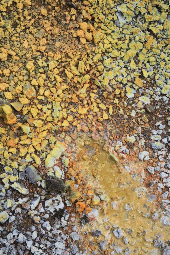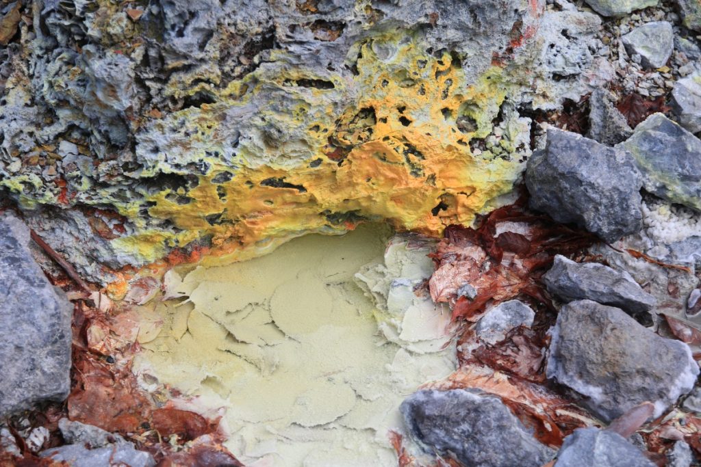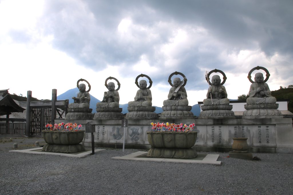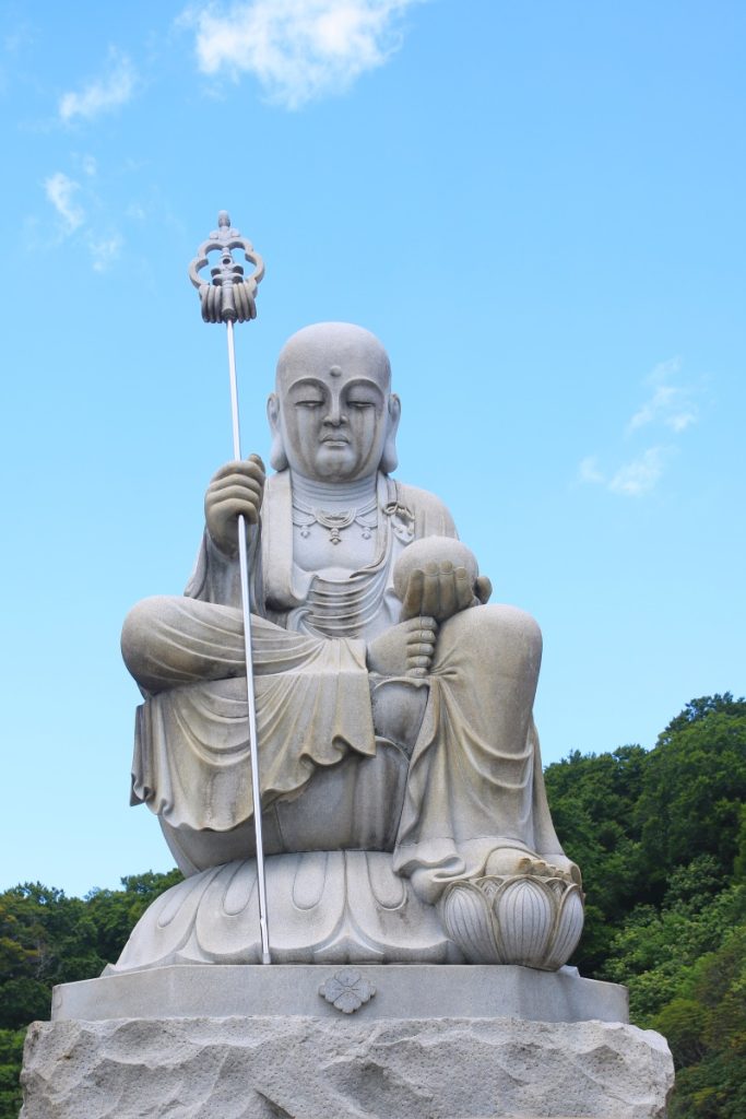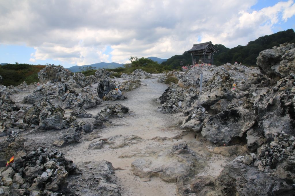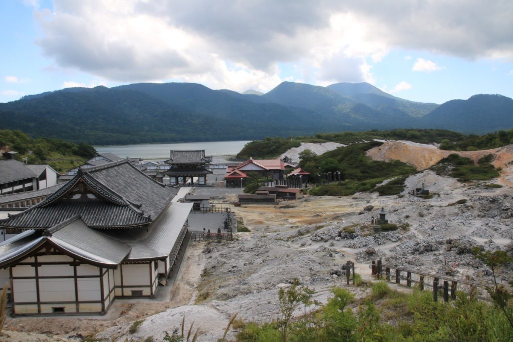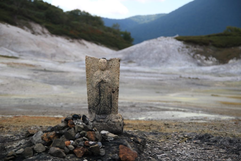 Osorezan is one of the most spiritual places in Japan. The Osoresan Bodaiji Temple was founded in 862 CE by Jikaku Daishi Ennin. He received a divine message in a dream telling him to travel east and find the holy peak. There, he should create an image of the Bodhisattva and establish Buddhism. The area surrounding the temple represents heaven and hell. The barren land represents hell. The heavy sulfur smell and yellow terrain prevent living organisms from inhabiting the area. The barren land is surrounded by a dense forest, creating a surreal atmosphere. There are many Buddhist statues in this spiritual area.