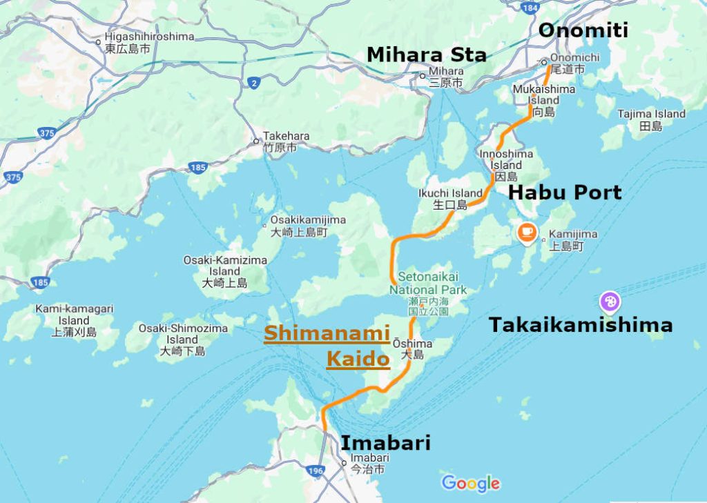 Take Shinkansen to Mihara Station. From Mihara Sta. walk to Mihara Port (290m). From Mihara Port take a ferry, Shimanami, to Habu Port (土生港).